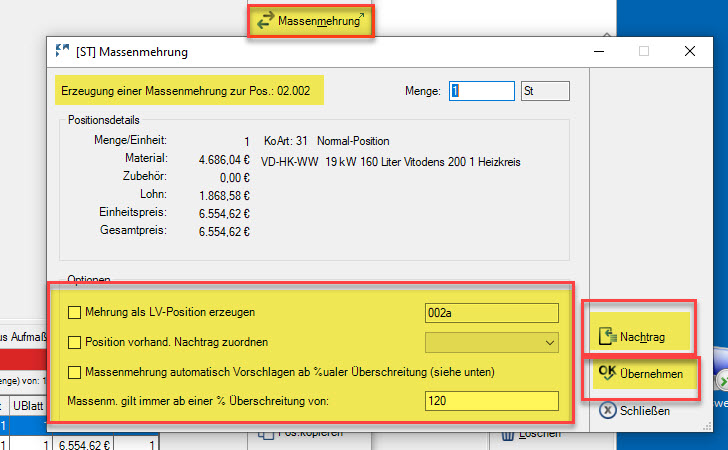 Sobald die Aufmaßmasse höher ist als die Angebotsmasse, kann über diese Funktion eine Massenmehrung durchgeführt werden. Innerhalb des nun erscheinenden Fensters können Sie die Mehrung durchführen. Hierbei wird eine weitere Position mit der entsprechenden Masse angelegt. Sie erkennen die Position an dem Buchstaben a hinter der Pos.Nr. Desweiteren haben Sie an dieser Stelle Zugriff auf die Nachtragsverwaltung. Sie können hier einen neuen Nachtrag anlegen oder auch diese Positionen einem bereits bestehenden Nachtrag zuordnen. Wann diese Funktion zum Tragen kommt, bestimmen Sie in der untersten Zeile dieses Fensters. Bei aktivierter Option kann das Programm Massenmehrungen automatisch vorschlagen.