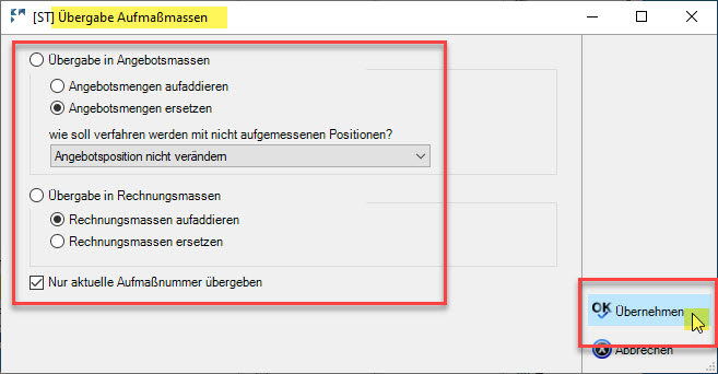 e) Wählen Sie den Übergabe-Umfang über die Auswahl von/bis Aufmaßnummer