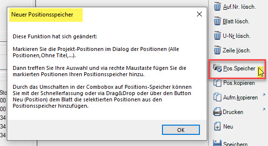 Diese Funktion hat sich geändert, Sie erhalten an der Stelle nur noch die Information wie der Pos. Speicher im neuen Aufmaß-Modul zu erreichen ist. Bitte beachten Sie hierzu die Hinweise. Der Positionsspeicher befindet sich nun links im Fenster Position. Hier können Sie Positionen markieren und mit der rechten Maustaste in den Speicher aufnehmen.