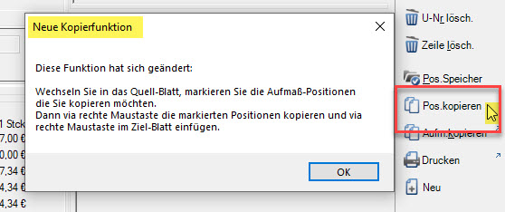 Diese Funktion hat sich geändert, Sie erhalten an dieser Stelle nur noch die Information wie Sie eine Position im neuen Aufmaß-Modul kopieren können. Bitte beachten Sie hierzu die Hinweise. Sie können nun eine bereits erfasste Position markieren und mit der rechten Maustaste kopieren. Nun können Sie in das gewünschte Aufmaß bzw. Blatt wechseln und mit der rechten Maustaste die Position wieder einfügen.