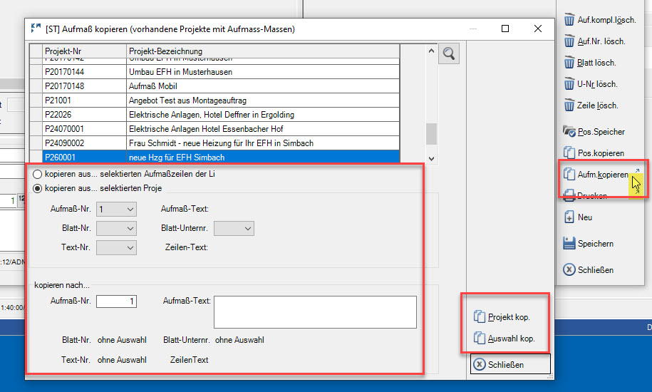 Hierüber können Sie anhand einer Auswahl ein komplettes Aufmaß kopieren oder einen Teil nach gesetzter Auswahl. Wenn das Projekt bereits erfasste Aufmaß-Massen hätte, würden diese angefügt werden. Hier warnt Sie das Programm allerdings nochmals vor dem Kopieren. Bitte beachten Sie dies, bevor Sie beginnen zu kopieren.
