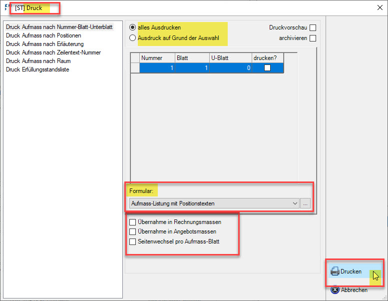 Über diesen Button erreichen Sie die Druckverwaltung. Hier haben Sie folgende Möglichkeiten das Aufmaß zu drucken bzw. den Druck auch zu archivieren: