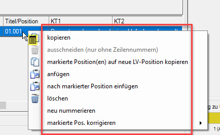 | markierte Position(en) auf neue LV-Position kopieren | die markierte(n) Position(en) werden als neue Position in das Projekt aufgenommen |