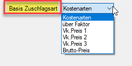 Mit der Basis Zuschlagsart wird festgelegt, welche der in den Kalkulationsdaten (Hauptmodul Verwaltung) hinterlegten Zuschlagsarten angewendet werden soll.