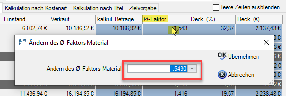 Mit den Änderungen in den Werte-Feldern ändert sich automatisch der Faktor sowie die Deckung in % und Euro.