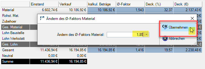 Um nun eine Hochrechnung vorzunehmen, klicken wir in ein bestimmtes Feld, wie z.B. den durchschnittlichen Faktor. Es öffnet sich ein neues Fenster, in dem der Wert für das Feld geändert werden kann.