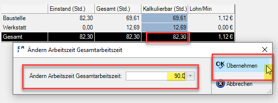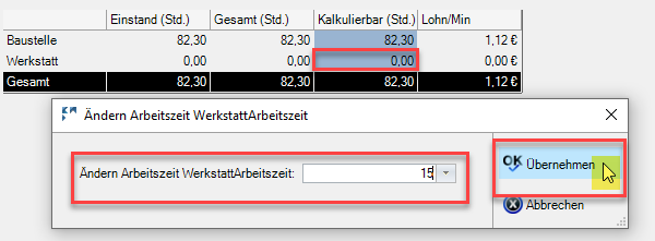 Die ursprünglich kalkulierten 82,30 Stunden werden nun auf die Baustelle und die Werkstatt verteilt, die Summe der ursprünglich kalkulierten Stunden bleibt unverändert.