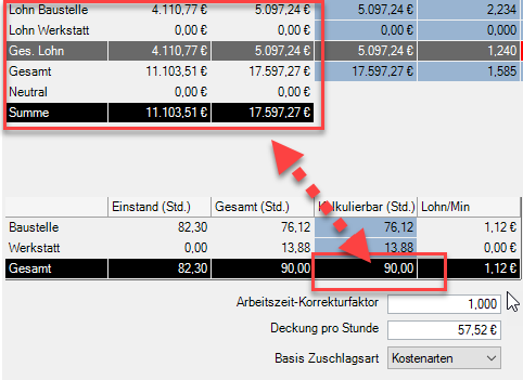 Die Werte für Baustelle und Werkstatt verändern sich, die Verhältnismäßigkeit der Werte zueinander bleibt erhalten (z.B. 80% Baustelle und 20% Werkstatt). Gleichzeitig ändert sich die Lohnsumme in der oberen Tabelle.