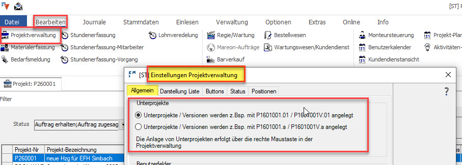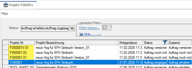 Das erste Unterprojekt in diesem Beispiel ist mit Positionen und trägt im Text den Zusatz Version_01. Das zweite Unterprojekt ist ohne Positionen und somit ohne Zusatz. Ergänzend haben wir hier eine Version angelegt, die ebenfalls den Zusatz Version_01 trägt, aber in der Projektnummer den Zusatz “V” trägt und somit eindeutig als Version erkennbar ist.