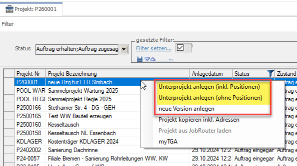 Unterprojekt anlegen (inkl. Positionen)das Unterprojekt beinhaltet alle Positionen des Hauptprojektes