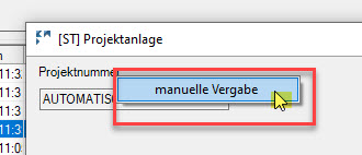 Die zweite Variante der Nummernvergabe erfolgt im Prozess der Neuanlage. “Neu” in der Menüleiste wählen und die Adresse übernehmen. Dann im Fenster der Projektanlage klicken sie mit der rechten Maustaste auf das Wort “Projektnummer“. Sie wählen “manuelle Vergabe“.