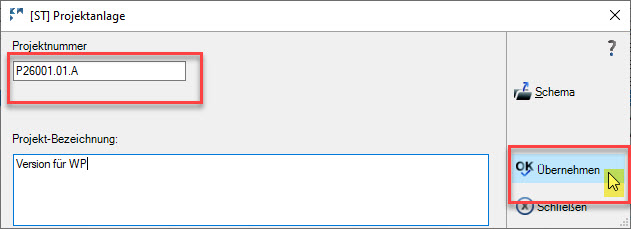 Jetzt können Sie die Projektnummer manuell eintragen und mit “OK übernehmen” speichern.